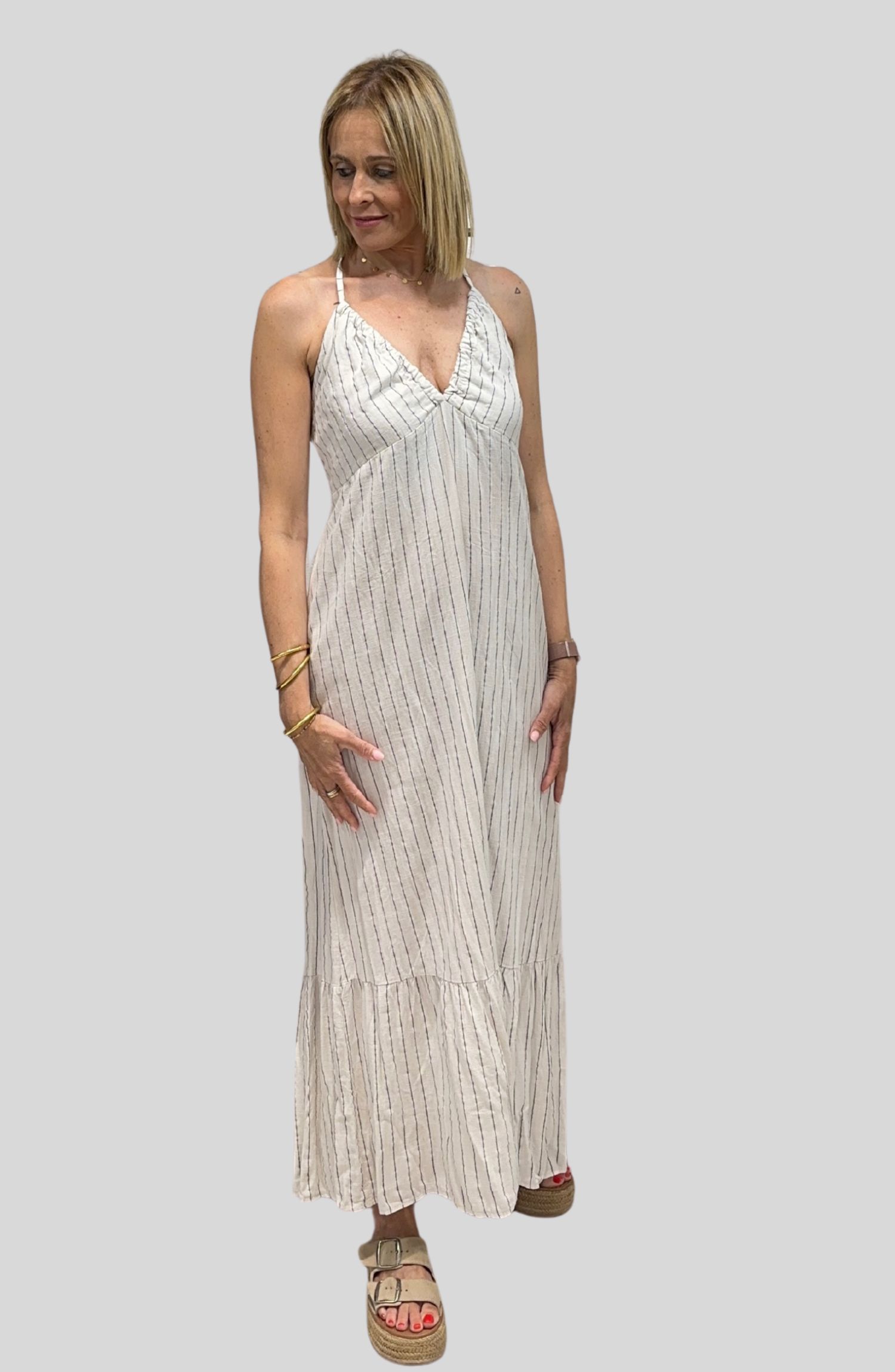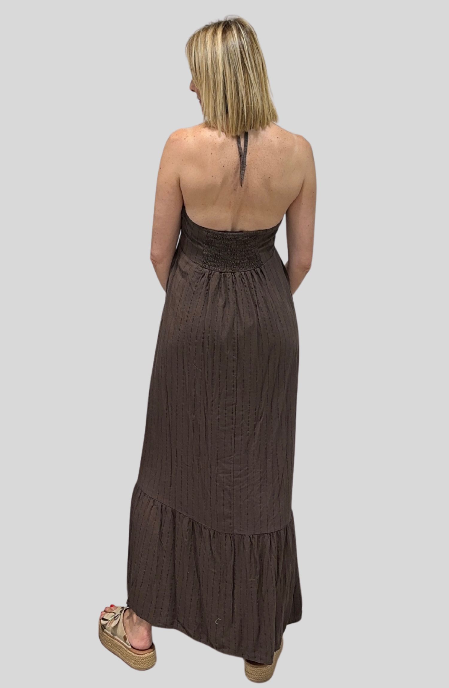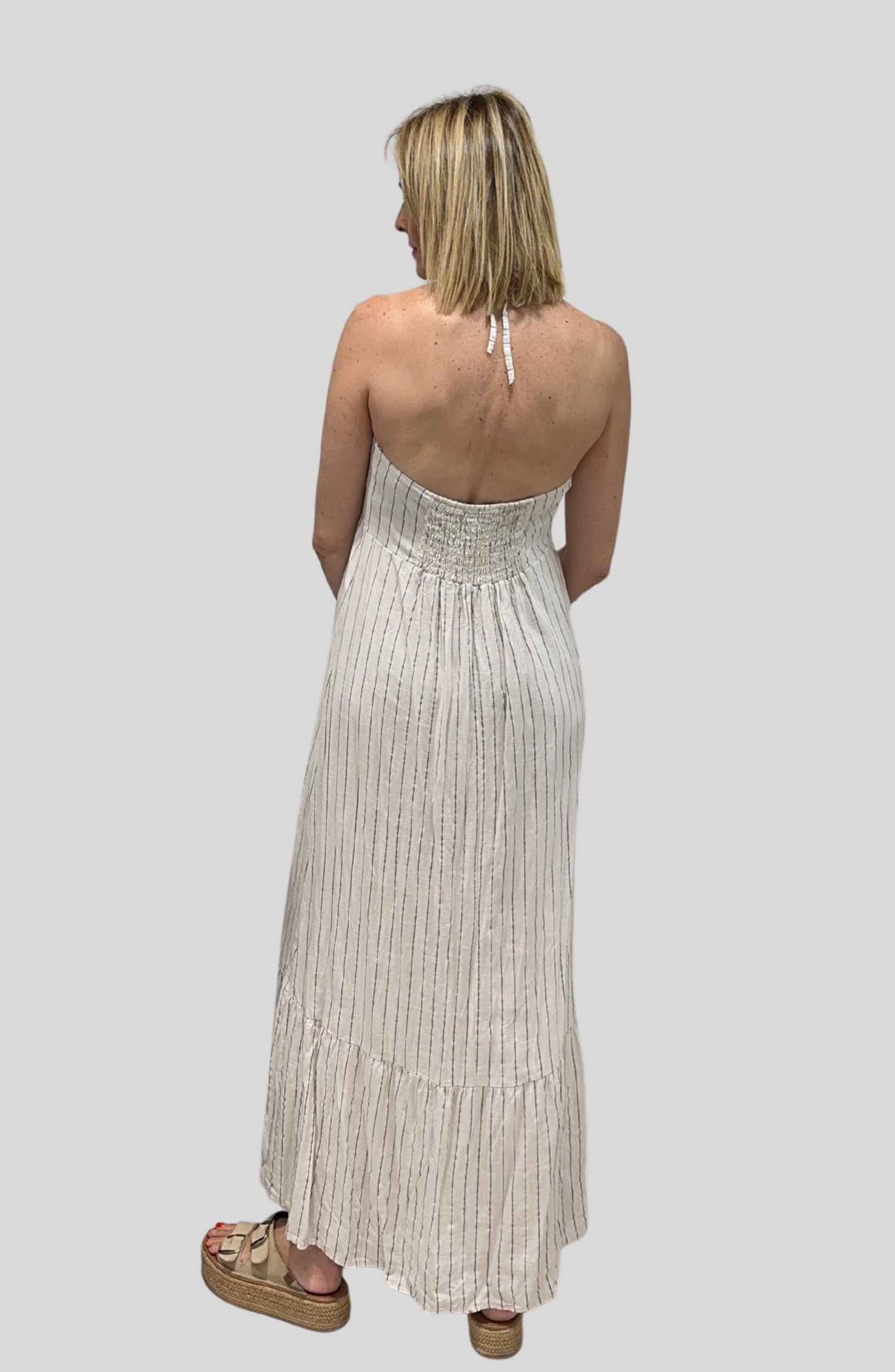 Vestido Largo con Raya y Espalda Semi Descubierta | Talla Única (Adaptable desde una talla 36 hasta una talla 40) — Elegancia Natural con un Toque Especial