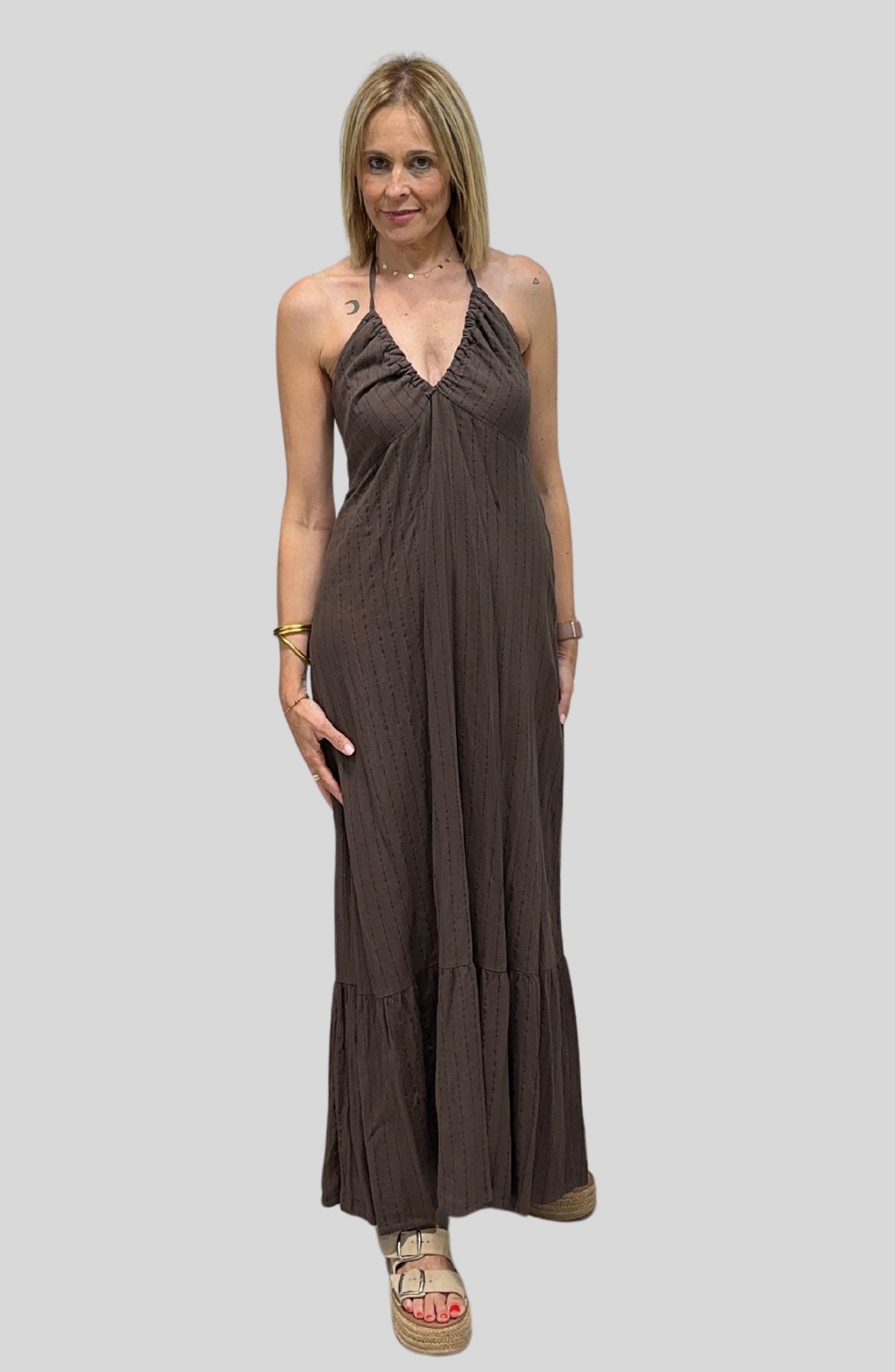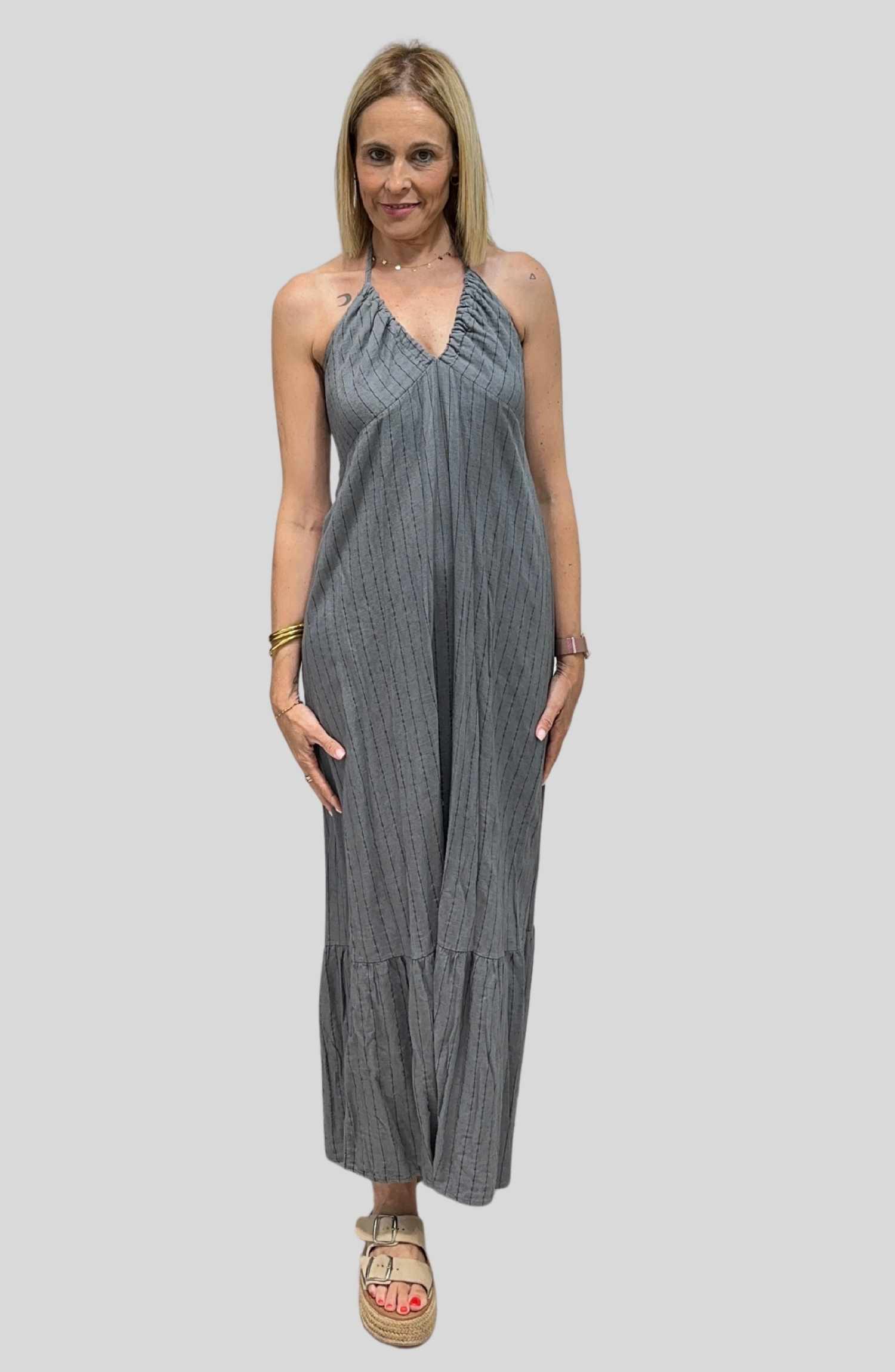 Vestido largo con diseño que realza la forma del pecho y se ata al cuello, dejando la espalda medio descubierta de forma muy favorecedora, pero con el plus de poder llevar sujetador cómodamente. Confeccionado en un tejido suave y ligero (85% viscosa, 13% lino, 2% poliéster), perfecto para los días de calor.