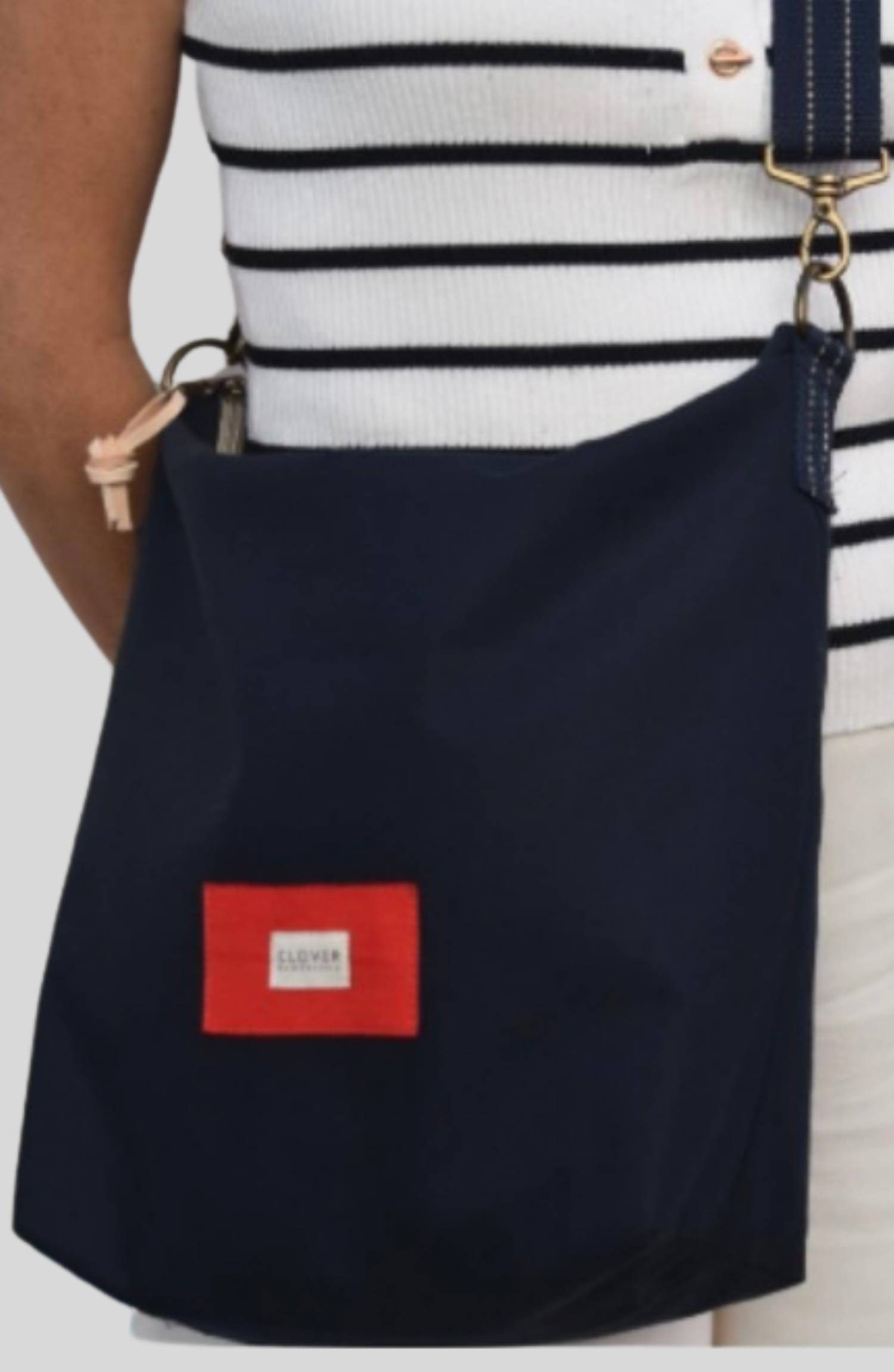 Bolso de color azul marino con detalles en color rojo. La correa es de color azul marino con líneas en color blanco y con hebilla para regularla. Lleva cremallera, forro interno y bolsillo interior.