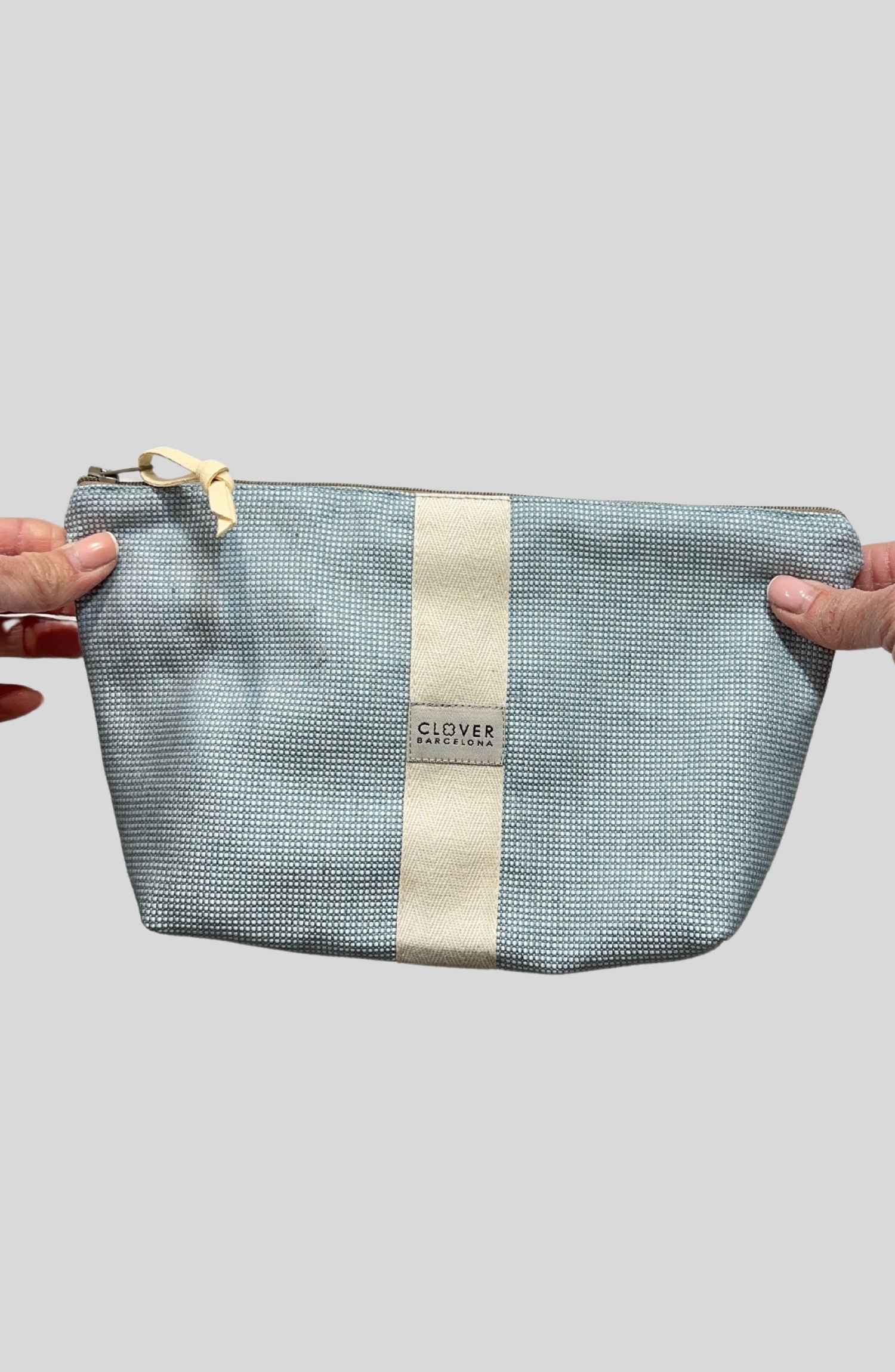 Neceser de tela con estampado en color azul. Lleva cremallera.